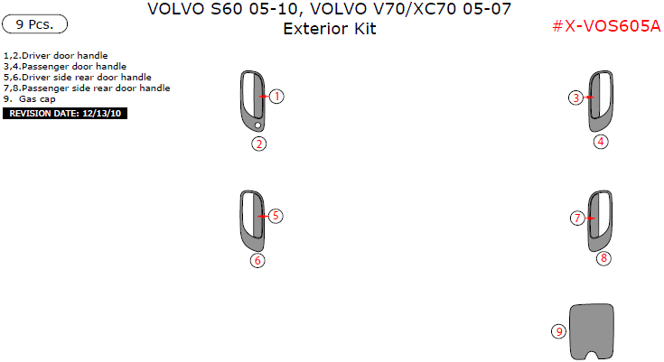 Volvo S60 (2005, 2006, 2007, 2008, 2009, 2010), V70/XC70 (2005, 2006, 2007), Exterior Kit, 9 Pcs.