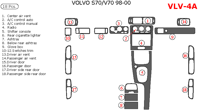 We offer a wide variety of colors and materials of Volvo S70/V70 1998, 1999, 2000, Interior Kit, 18 Pcs. Choose your favourite option and place an order.