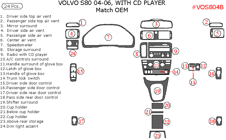 We offer a wide variety of colors and materials of Volvo S80 2004, 2005, 2006, Interior Dash Kit, With CD Player, 24 Pcs., OEM Match. Choose your favourite option and place an order.