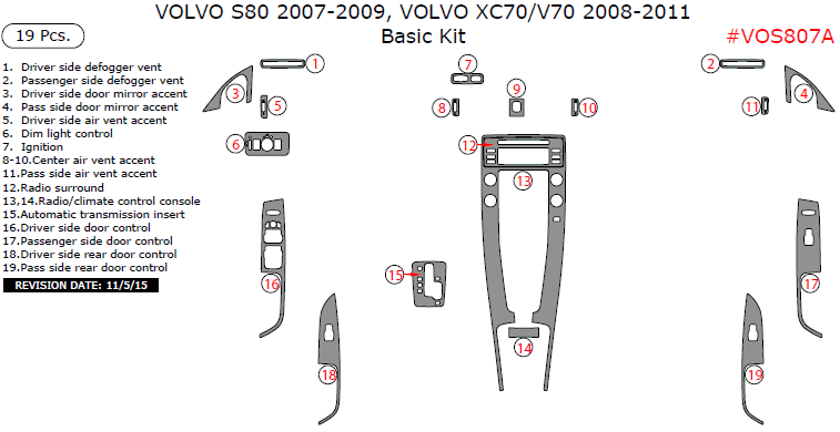 Volvo S80 2007, 2008, 2009, Volvo V70/ XC70 2008, 2009, 2010, 2011, Basic Interior Kit, 19 Pcs.