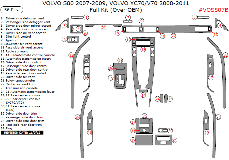 Volvo S80 2007, 2008, 2009, Volvo V70/XC70 2008, 2009, 2010, 2011, Full Interior Kit (Over OEM), 36 Pcs.