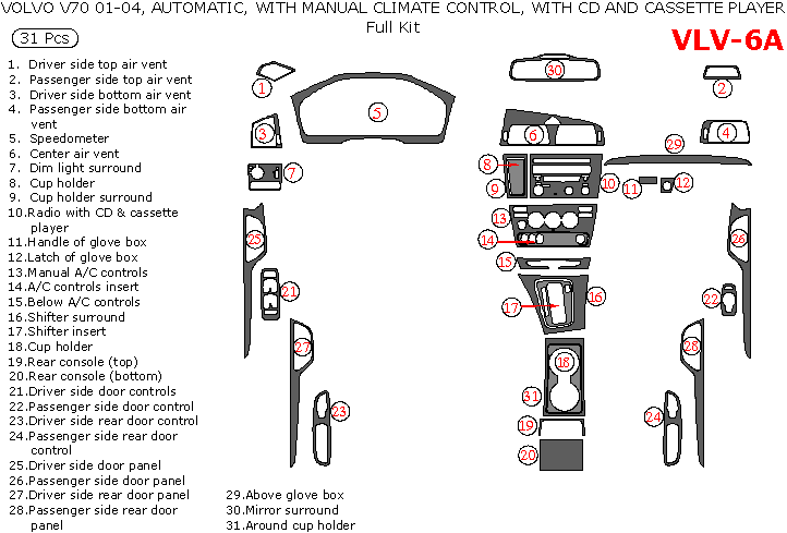 Volvo V70 2001, 2002, 2003, 2004, Full Interior Kit, Automatic, With Manual Climate Control, With CD And Cassette Player, 31 Pcs.