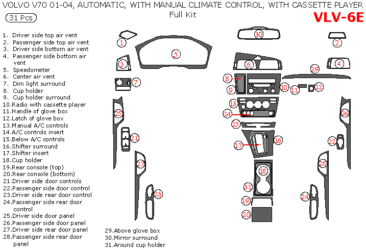 Volvo V70 2001, 2002, 2003, 2004, Full Interior Kit, Automatic, With Manual Climate Control, With Cassette Player, 31 Pcs.