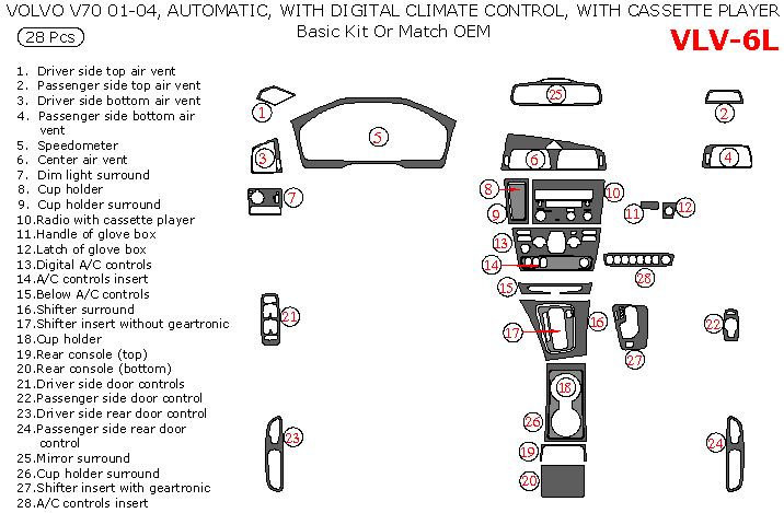 Volvo V70 2001, 2002, 2003, 2004, Basic Interior Kit or OEM Match, Automatic, With Digital Climate Control, With Cassette Player, 28 Pcs.
