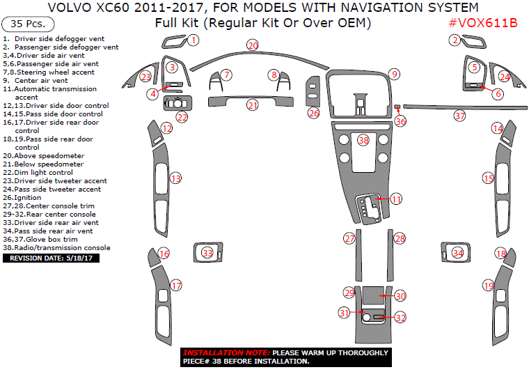 Volvo XC60 2011, 2012, 2013, 2014, 2015, 2016, 2017, For Models With Navigation System, Full Interior Kit (Regular Kit Or Over OEM), 35 Pcs.
