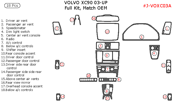 Volvo XC90 2003, 2004, 2005, 2006, 2007, 2008, 2009, 2010, 2011, 2012, 2013, 2014, Japan, Full Interior Kit, 18 Pcs., Match OEM