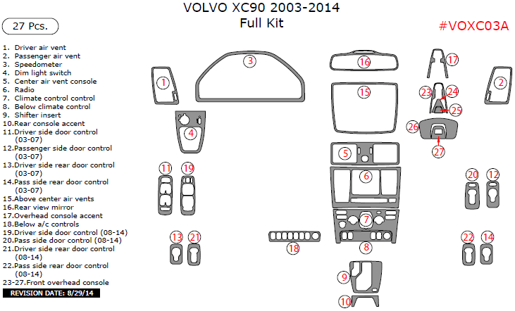 Volvo XC90 2003, 2004, 2005, 2006, 2007, 2008, 2009, 2010, 2011, 2012, 2013, 2014, Full Interior Kit, 27 Pcs.