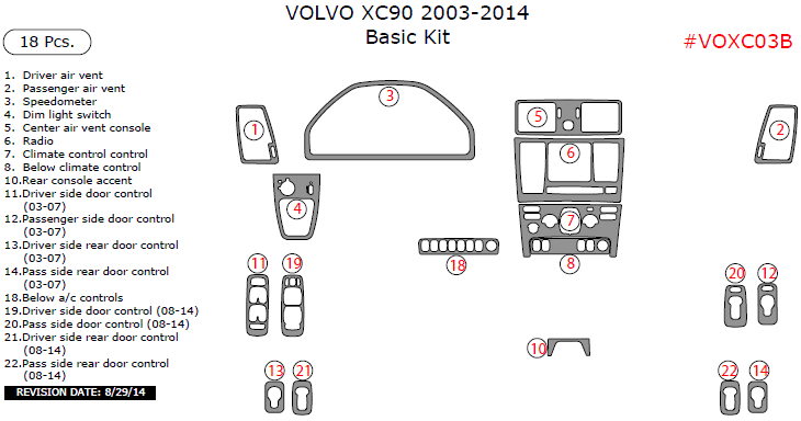 Volvo XC90 2003, 2004, 2005, 2006, 2007, 2008, 2009, 2010, 2011, 2012, 2013, 2014, Basic Interior Kit, 18 Pcs.
